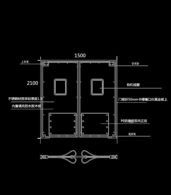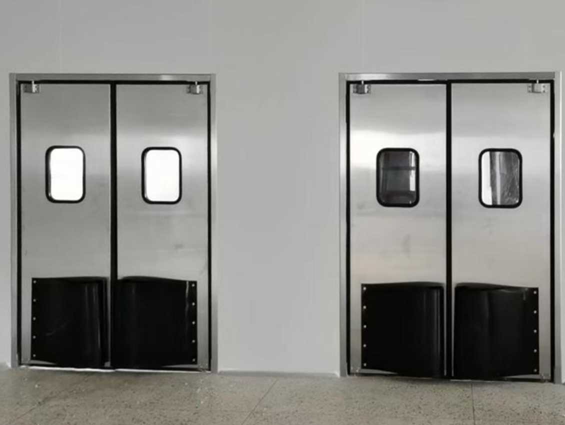 不锈钢自由门符合食品行业卫生标准,正反两面选用不锈钢板材制造,中间夹层 木材经过特殊处理具有防腐抗潮作用,不锈钢板材与木材采用复合胶粘连后并用 压机固定 24 小时使门板保持优异的抗冲击性。以上结构使门体可进行有水作业 并易于冲洗。自由门门体两侧加防撞橡胶板,具有坚固,耐冲击,使用寿命长等 特点。满足了各种工业环境要求,比如:叉车的作业、手推车的作业。